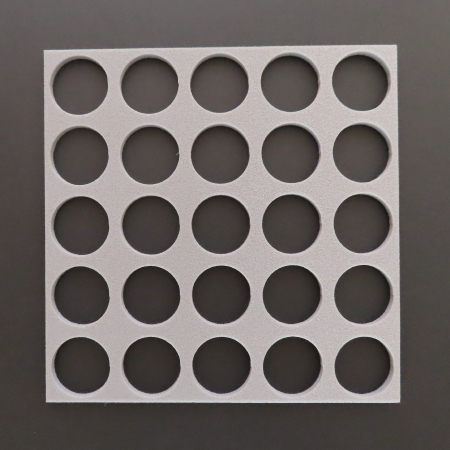 ペットボトルのキャップをはめ込むクッション素材の簡易パネルです。180mm角の正方形パネルには25個のキャップ穴が開いていて、複数枚並べてボードなどに固定することで、キャップモザイクアートの土台になります。作品制作に必要なモザイク数や完成サイズに合わせて、自由にパネル枚数や配列を調整できます。ボードができたら、お客様の用意した設計図に沿ってキャップをはめていくと作品が完成します。